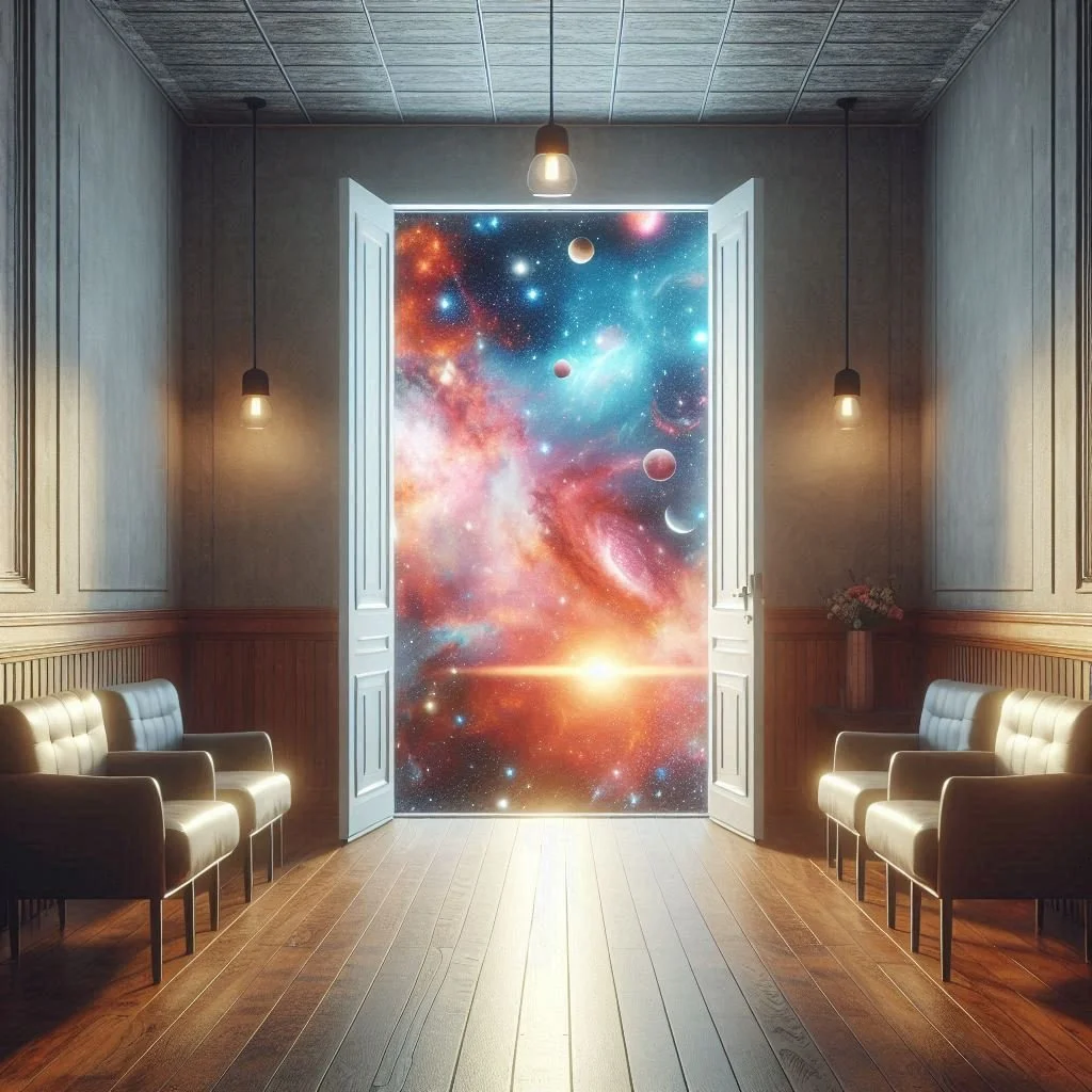 Roger folgte ihr und trat leicht nervös in das wolkige Licht hinein. Für einen kurzen Moment sah er nichts. Es war so hell, dass er die Augen zusammenkneifen musste. Nach einer Weile liess die Helligkeit aber nach, und was er dann sah, verschlug ihm regelrecht den Atem. Vor ihm, über ihm, unter ihm, ja überall, erstreckte sich die unendliche Weite des Universums. Tausende Sterne erleuchteten das ewige Schwarz des Weltalls, ganze Galaxien drehten sich in weiter Entfernung um die eigene Achse. Die Tür hinter Roger war verschwunden. Er fühlte sich schwerelos, empfand nichts anderes als die pure Überwältigung dieses Anblicks. Ihm kamen die Tränen.